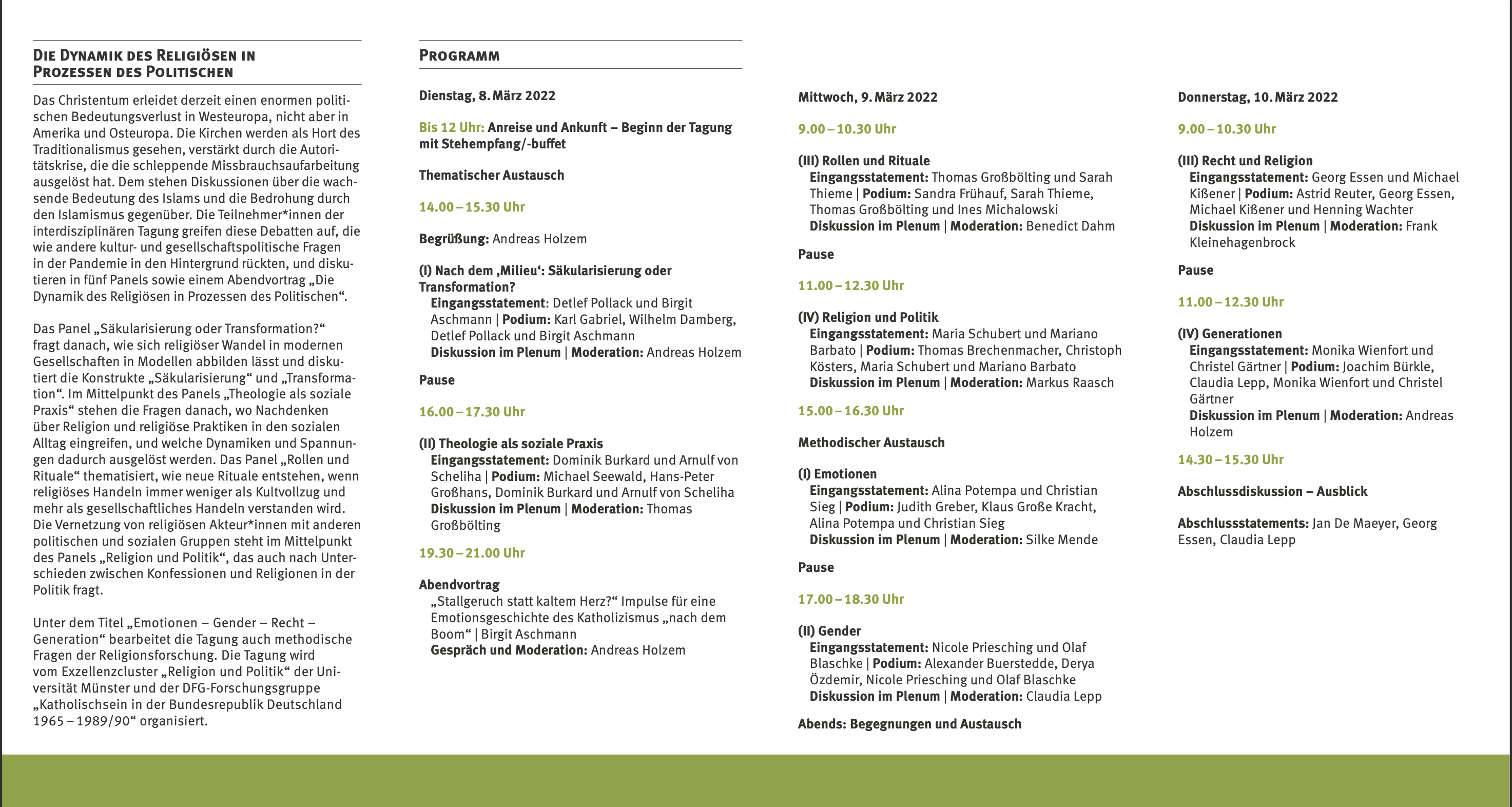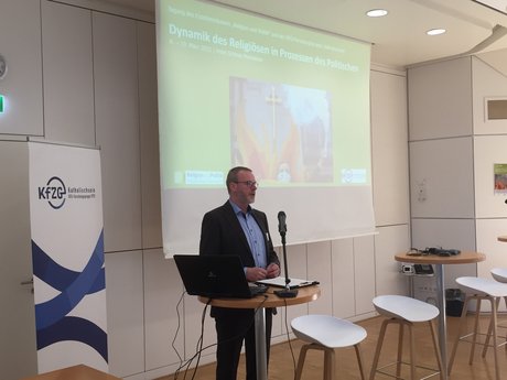 Ein weiteres thematisches Panel widmete sich Fragen von Religion und Politik. Gesellschaftliche Reformen konfrontierten den Katholizismus in den 1970er Jahren mit erheblichen Problemen, die eine Neuorientierung bedingten. Teile des deutschen Katholizismus reagierten dabei mit einer Öffnung nach links und hoben dabei die Ideen der Befreiungstheologie hervor. Mit der Polarisierung der Gesellschaft in dieser Zeit ging ebenso eine Polarisierung des Glaubens einher. So vollzog sich eine Hinwendung von Teilen der katholischen Gläubigen zu den neuen sozialen Bewegungen wie der Friedens- oder Umweltbewegung. Im Zuge dieser Neuausrichtung etablierten sich spezifische Praktiken wie das Beten oder Fasten für den Frieden. Eine Politisierung des Glaubens war die Konsequenz dieser Prozesse, die in den 1980er Jahren ein neues katholisches Umwelt- und Schöpfungsbewusstsein hervorbrachten.